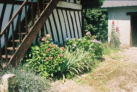 Dans le jardin devant la maison. Sur le parking, vue du pignon avec l'escalier, à droite le garage :