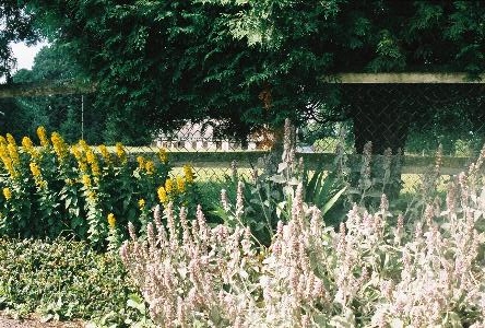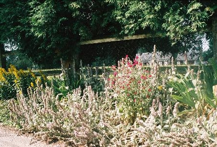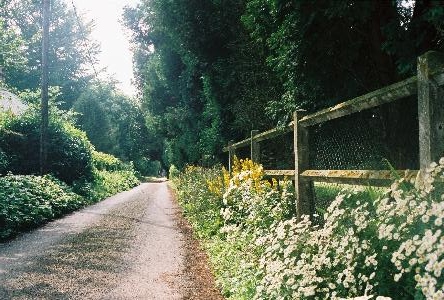 Les fleurs le long de l'impasse, le même jour. On aperçoit la maison au loin, derrière les arbres :