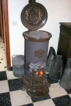 Le poêle : Le poêle fonctionne très bien, aussi bien avec du bois qu'avec du charbon. Mais comme tous ces appareils il est difficile à allumer et doit être particulièrement surveillé pendant la phase d'allumage. Avant de l'allumer, il doit être complètement vidé. Mettez un peu de papier de journal au fond, puis du charbon de bois. Quelques petites branches de bois sec. Allumez avec un "allume vite". Contrôlez la situation pour que le tirage ne soit pas trop important en refermant progressivement la porte de façade. Quand le feu s'installe mettez quelques morceaux de charbon. Refermez complètement la porte et régler le tirage avec la vis placée sur la porte. Un fois le coeur du feu démaré, mettez un seau de charbon. Vous pouvez ensuite mettre un deuxième seau. il ne faut pas le remplir plus qu'au 2/3 du trou de sortie des fumées. Une fois rempli de cette façon et si vous mettez le tirage au plus bas, il peut tenir une dizaine d'heures sans s'éteindre avant d'être rechargé. Il peut fumer au début, attention de ne pas le laisser s'emballer, il faut le surveiller pour réduire le tirage quand il ronfle trop. Le parc à charbon peu contenir environ 400 kg de charbon.